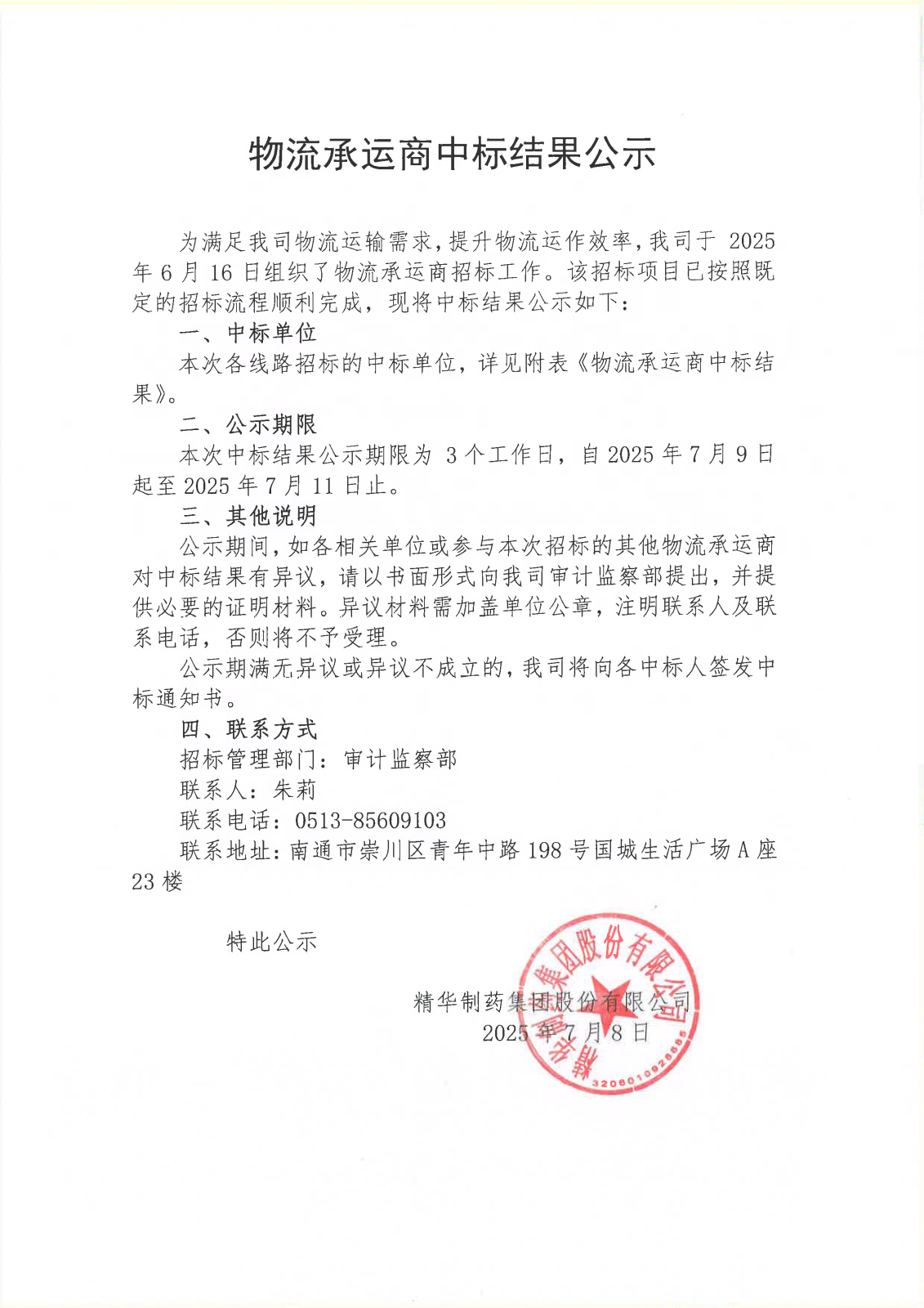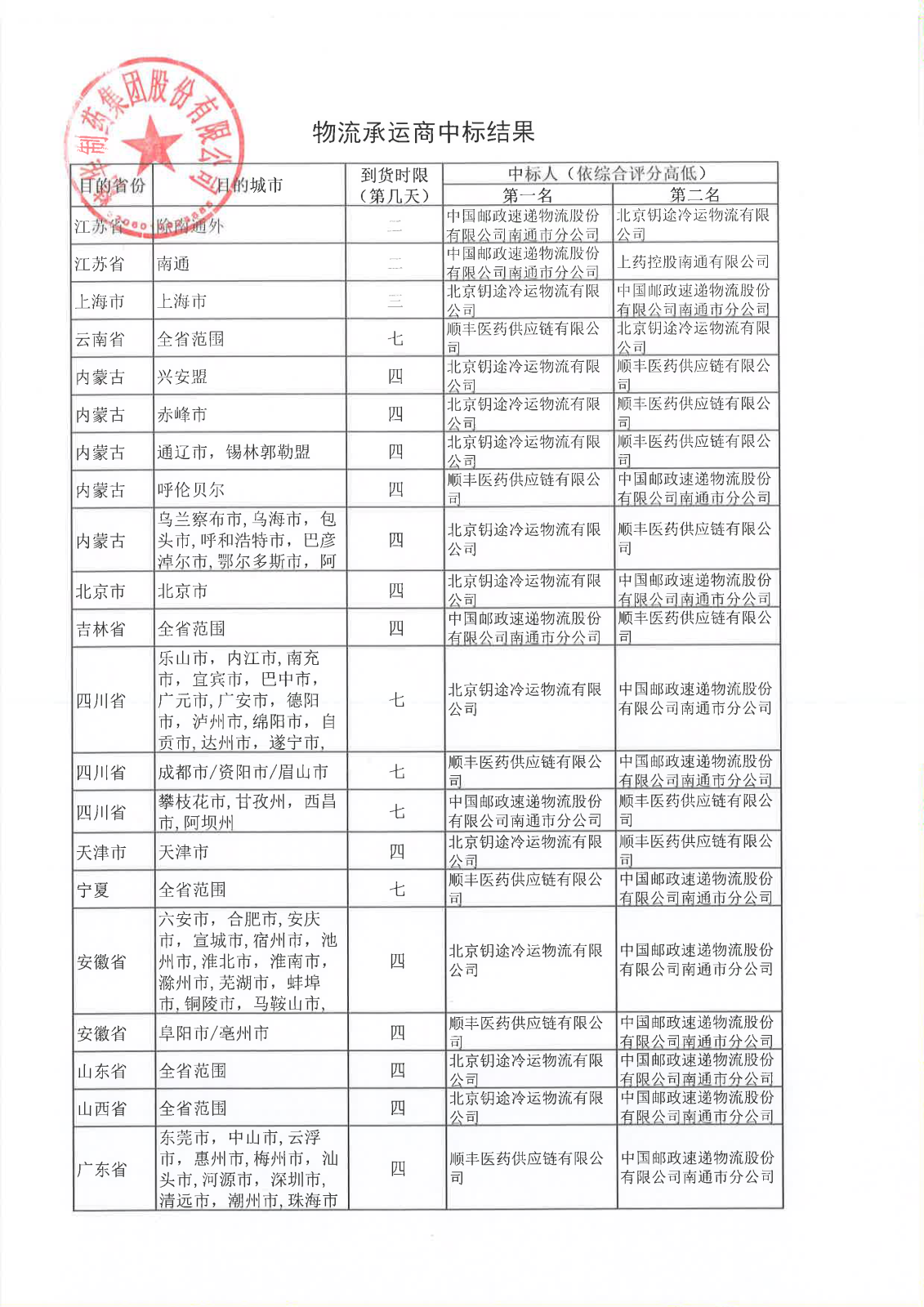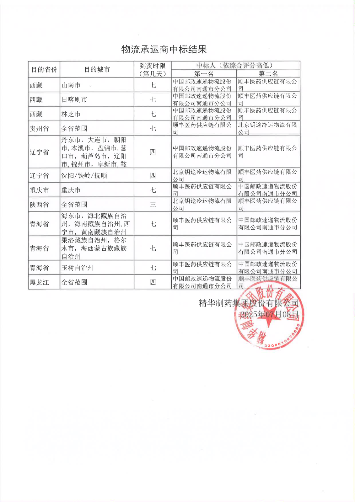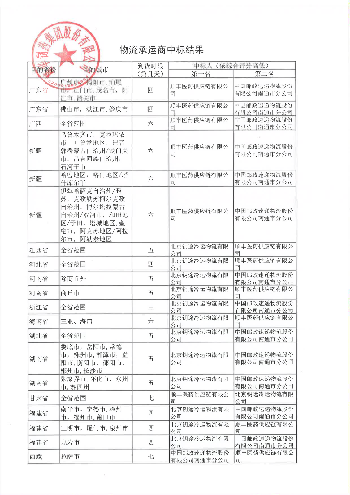物流承运商中标结果公示
